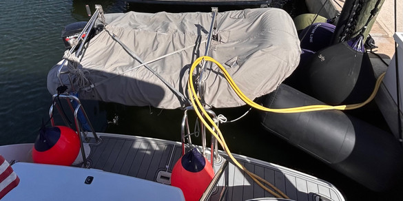 Our dinghy, not so fancy, but gets the job done. It is the most common of them all. The first picture, Joel is working on replacing a clamp that holds the dinghy to the boat. The next picture is ours all wrapped up and ready for the next trip. Joel may get a new one when we finish the loop! It will depend on how much we use it.